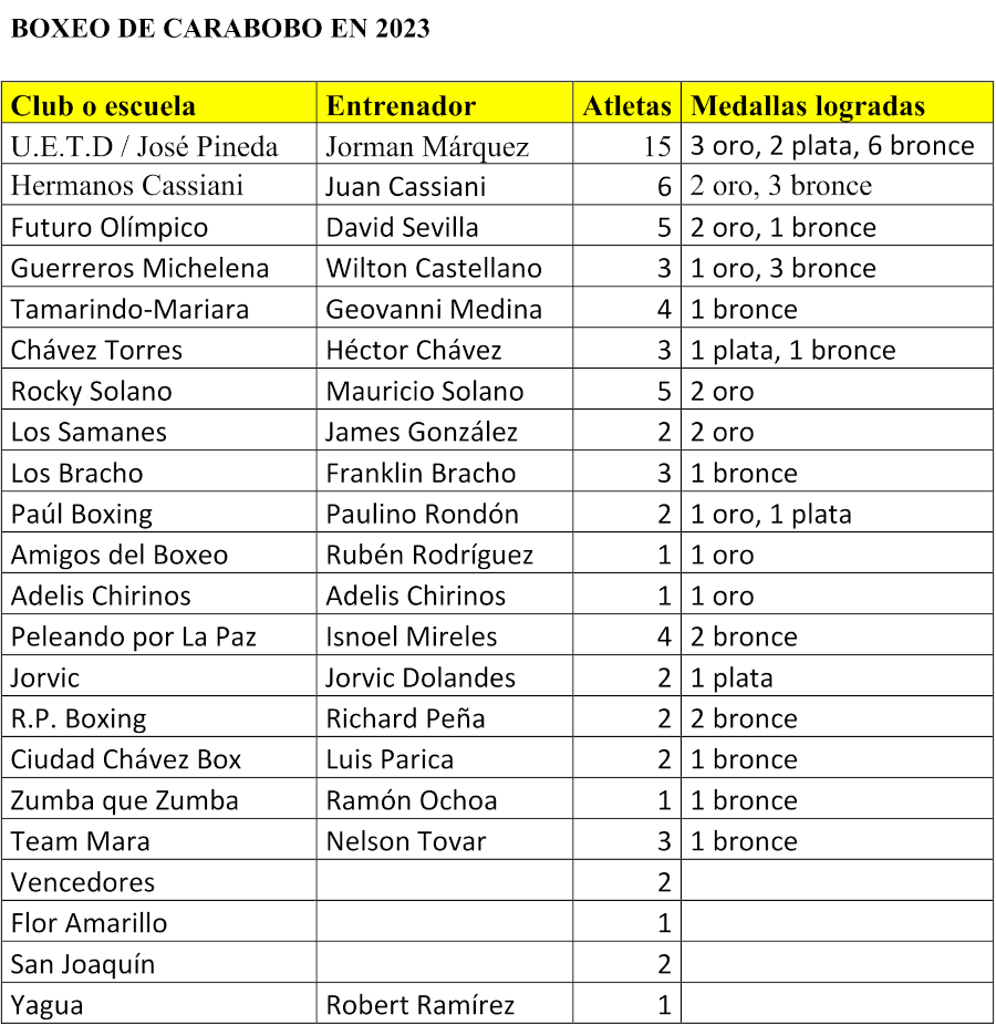 De esta manera se destaca que la selección de boxeo del estado Carabobo logró un total de 15 medallas de oro 6 medallas de plata y 24 medallas de bronce en los Campeonatos Nacionales, para un total de 45 medallas obtenidas en el año 2023.