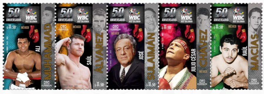 En las estampillas, aparecen Raúl “Ratón” Macias, Muhammad Ali, Julio César Chávez, Saúl “Canelo” Álvarez y el presidente vitalicio del CMB, José Sulaiman.