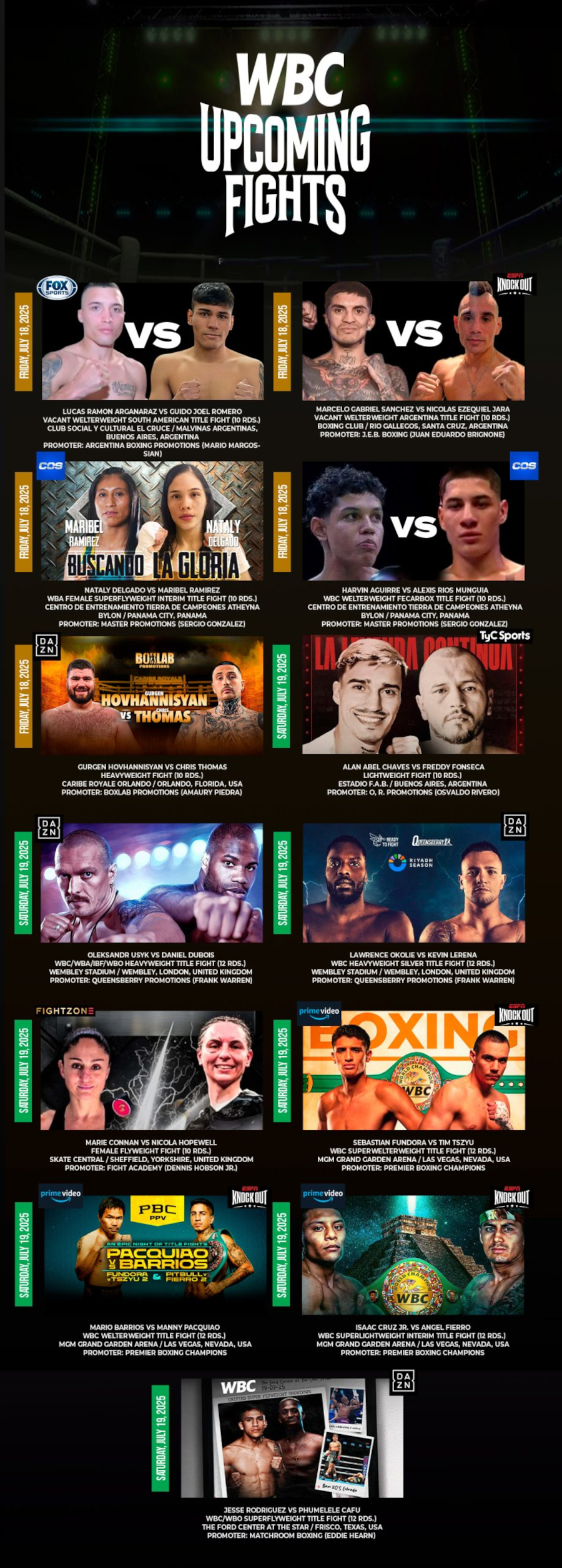 Prensa/CMB/Jabeando/17-07-2025.- El Consejo Mundial de Boxeo te presenta la cartelera televisiva, en la que te indica la variedad de boxeo mundial que podrás observar por distintos medios televisivos.