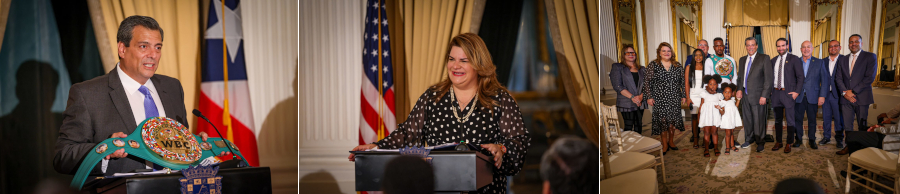 Presentamos oficialmente el cinturón de campeonato mundial del CMB a la estrella puertorriqueña Subriel Matías en la casa de gobierno, llamada La Fortaleza, donde la Gobernadora de Puerto Rico nos honró con su presencia. Jennifer González lideró el evento, acompañada por el líder de la Cámara de Representantes, el Ministro de Deportes y otras personalidades. Nuestro gran campeón Juan Laporte, así como nuestro representante en Puerto Rico, Edgardo López Sazzo, formaron parte del comité. Por parte del campeón, su esposa, sus dos hermosas hijas, su promotor Juan Orengo, su mánager y su entrenador, Nelson Adams, estuvieron todos allí. Adams también recibió su cinturón de entrenador, un premio creado por Don José para reconocer a aquellos que coronan con éxito a un campeón del CMB.