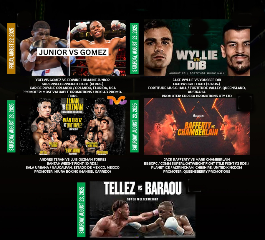 Prensa/CMB/Jabeando/21-08-2025.- El Consejo Mundial de Boxeo te presenta la cartelera televisiva, en la que te indica la variedad de boxeo mundial que podrás observar por distintos medios televisivos.