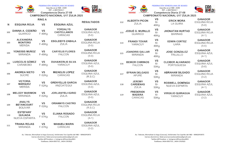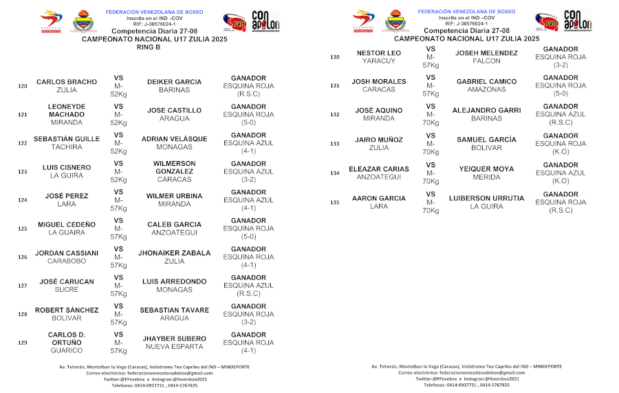 De acuerdo con la información suministrada, para Jabeando, por el calificado dirigente de la Federación Venezolana de Boxeo Eduardo León Hidalgo se conoció los resultados de la jornada celebrada el 27 de agosto de 2025 que se determinan en los siguientes cuadros.