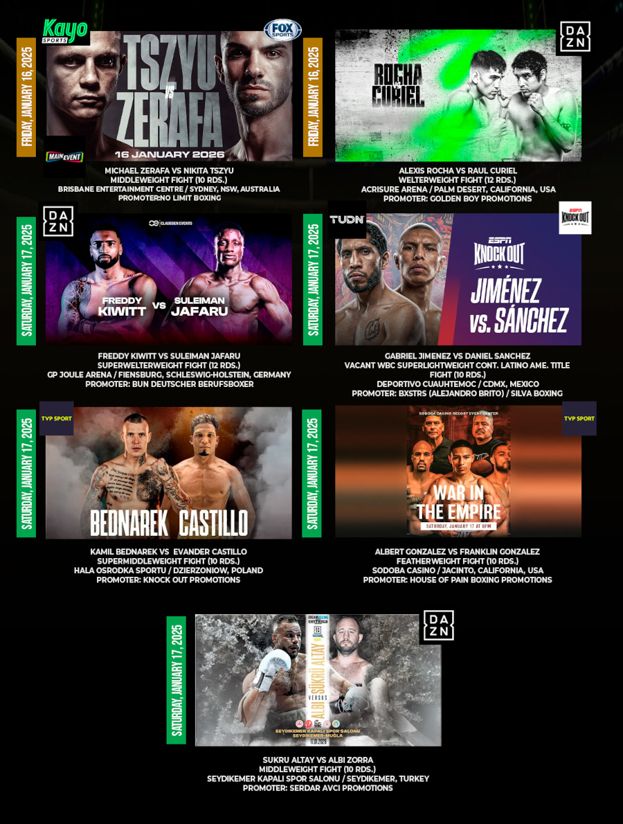 Prensa/CMB/Jabeando/15-01-2026.- El Consejo Mundial de Boxeo te presenta la cartelera televisiva, en la que te indica la variedad de boxeo mundial que podrás observar por distintos medios televisivos.